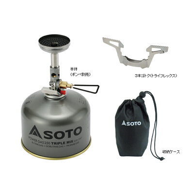 <バーナー単体(ゴトクなし)> 寸法 幅90×奥行117×高さ100mm(使用時) 幅47×奥行51×高さ88mm(収納時) <標準セット3本ゴトク(トライフレックス)使用時> 寸法 幅90×奥行117×高さ100mm(バーナー+ゴトク使用時※1) 幅94×奥行10×高さ35mm(ゴトクのみ収納時) <3本ゴトク、4本ゴトク使用時共通スペック> 付属品 3本ゴトク・専用収納ケース 【4本ゴトク・ボンベ別売】風の強い場所でもバーナーの炎が流れにくい!