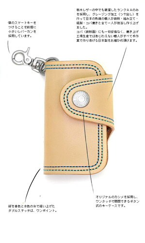 オリジナルのカシメを採用し、ワンタッチで開閉できるボタン式のキーケースです。